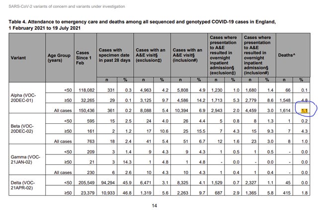 On page 14, you will see (last column on right, third row from top) that the Alpha CFR (Case Fatality Rate) is 1.1%