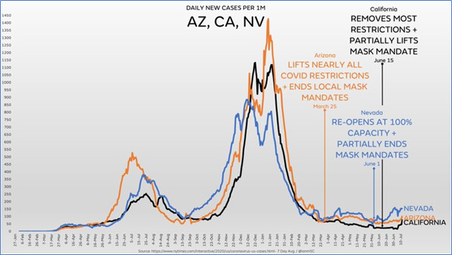 “We’re up to seventeen months of Arizona, California and Nevada following nearly identical case curves despite vastly different policies & timing They “re-opened” at wildly different intervals, still followed the same curve and yet experts relentlessly pretend any of it matters” @ianmSC