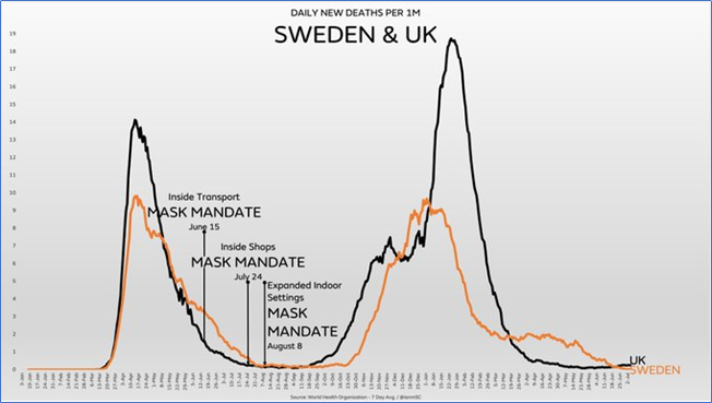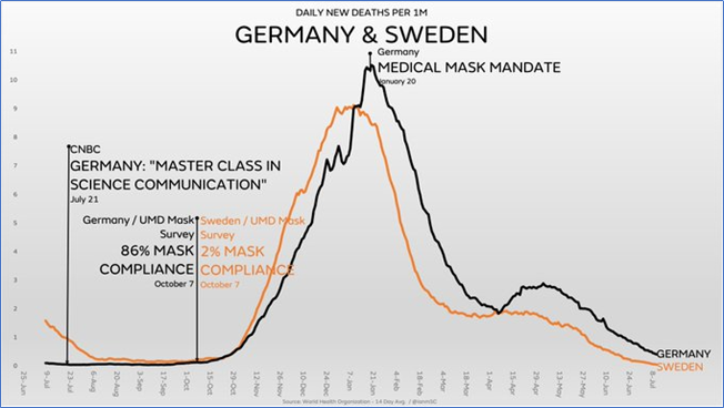 “For essentially all of 2021, Germany has reported more daily new deaths than Sweden, despite extraordinarily high mask compliance, a medical grade mask mandate plus N95 mandates & testing requirements to enter shops in some states” @ianmSC