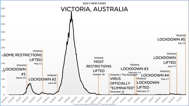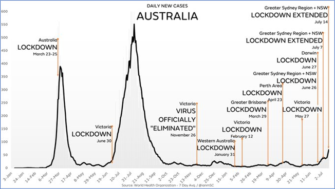 When the virus is triggered and starts doing the round, it rises and falls whether you are locking down or not. Look at Victoria’s second lockdown on 30 June. A few cases were found, so they shut the state down. What happened to daily new cases? They kept rising and rising exponentially. Why would that happen if Lockdowns worked? Simple answer is: They don’t.