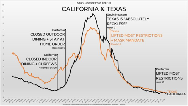 “Well, we're approaching a year of California & Texas having nearly identical numbers despite California's lockdowns & masks and Texas's "reckless" re-opening If it looks to you like none of these interventions matter at all, it's because none of these interventions matter at all” @ianmSC