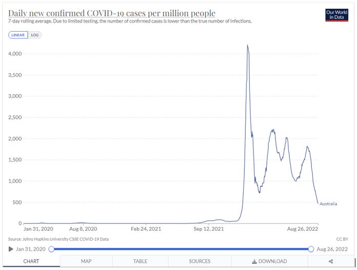 And very recently, on 26-07-22, it’s “down” to 12,178 per day, this with almost everyone in the country double jabbed and 71% of 16+ triple jabbed and now 4.6m Australians have gone back to the fuel pump for a 4th dose.
