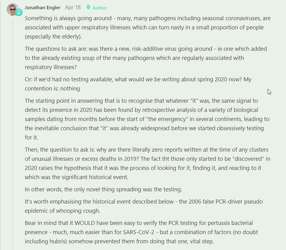 Again, I reject these assertions. These tests are not - in themselves - proof of a novel spreading pathogen. I am not going to be expansive here on why, but I have written or co-authored many articles on this.