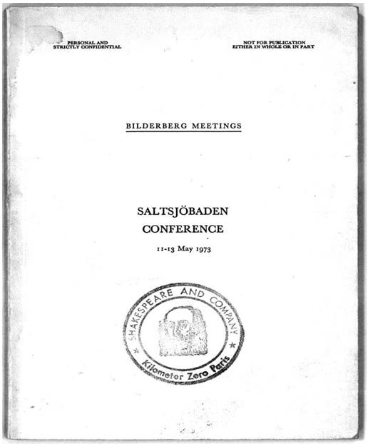 Figure 5 Cover page of the confidential protocol of the 1973 Bilderberg meeting at Saltsjöbaden. The page bears the stamp of the Paris bookseller from whom the minutes were bought by the author.