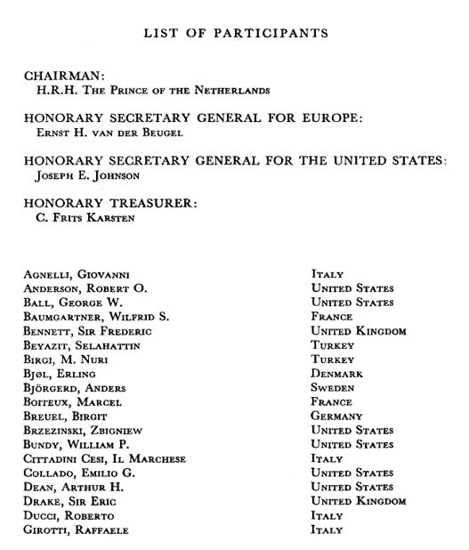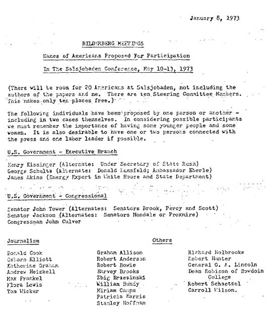 Figure 8 Partial list of official attendees at the 1973 Bilderberg meeting. It includes ARCO head Robert O. Anderson, Zbigniew Brzezinski and George Ball.
