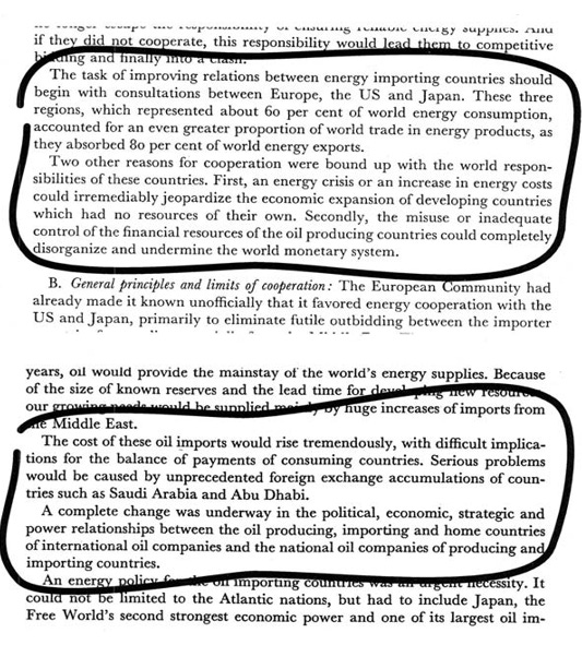 The American speaker to the Bilderberg on Atlantic–Japanese energy policy, was clear enough. After stating the prospect that future world oil needs would be supplied by a small number of Middle East producing countries, the speaker declared, prophetically: ‘The cost of these oil imports would rise tremendously, with difficult implications