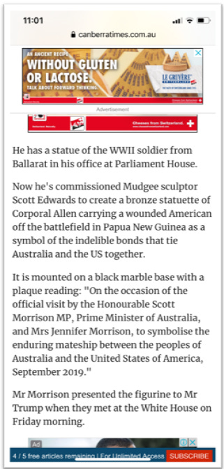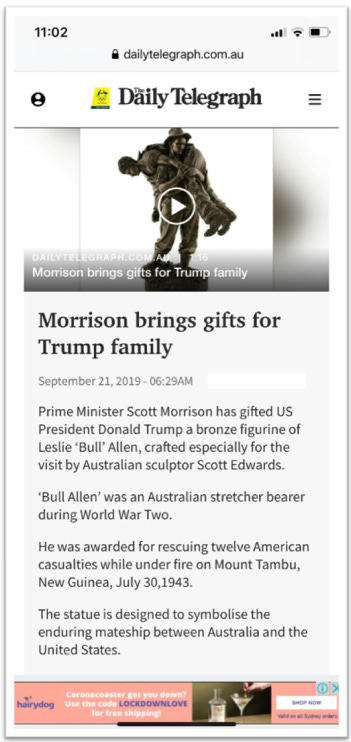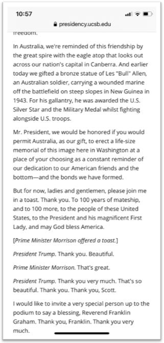 At that same State Dinner at the Whitehouse, you asked if President Trump would permit Australia, as our gift, to erect a life-size memorial of [the statue] in Washington as a constant reminder of our dedication to our American friends and the bonds we have formed. I remain unaware of whether that offer has been accepted. But nonetheless, I was again delighted that my gift had made such an impact.