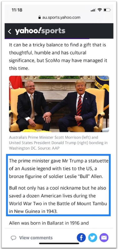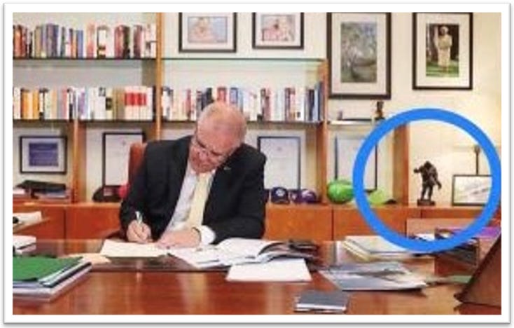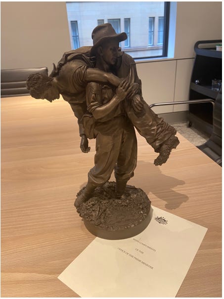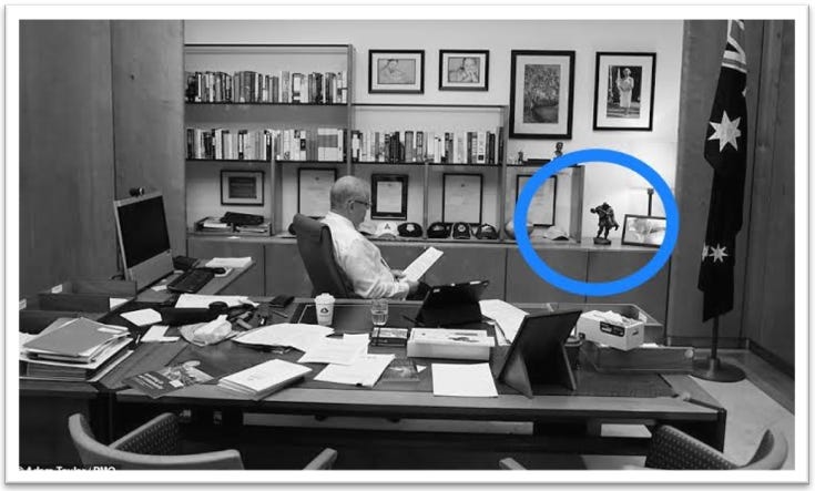 At a meeting in his Canberra office in December 2018, then NDIS Minister, Stuart Robert, excused himself after some time as he had to leave for a meeting in your office (you were PM now). As he stood to leave, I suggested he mention that he had just been meeting with “the bloke who gave [you] the Bull Allen statue”.