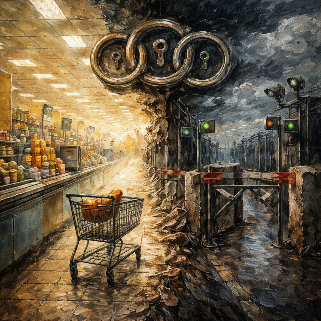 This essay documents the machine — what parts exist, what parts are being built, and how fast it’s moving. The technical sections explain the details. But the core is simple: the system that checks if you can buy things is being upgraded to check much more than whether you have money.