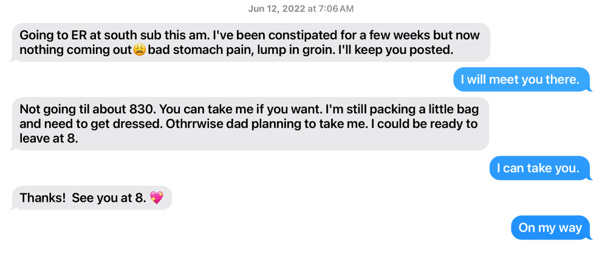On June 12, 2022 I took my mom to the emergency room. She had been constipated, and had discovered a small, painful lump in her groin.