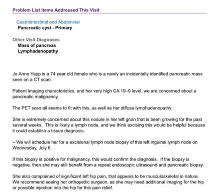On July 1, the PET scan results came back. It said that the doctors were “concerned about a pancreatic malignancy.”