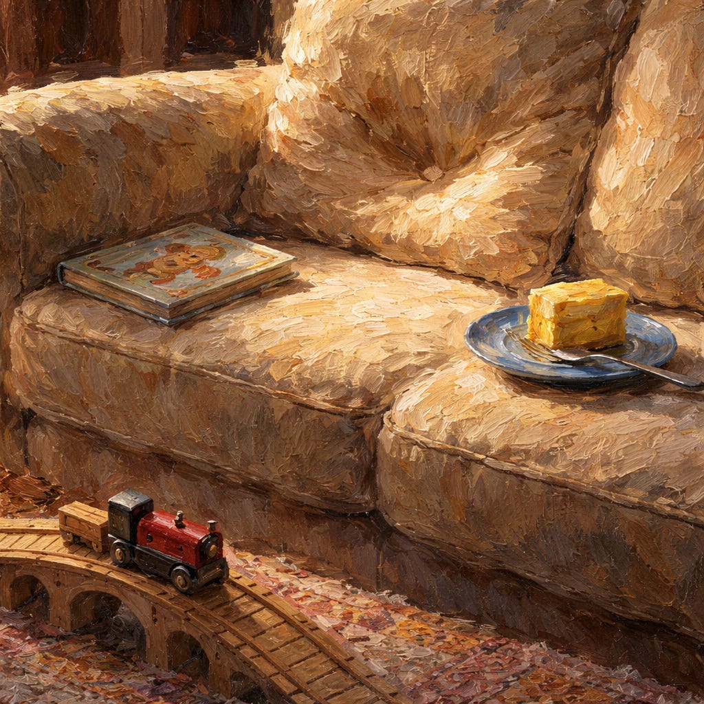 Then I go back inside and close the door and walk down the hall to the living room. The train is still on the bridge. The bear book is on the cushion. The basket is open on the rug. I sit down on the sofa, in the warm patch where Henry was, and put my hand on it.