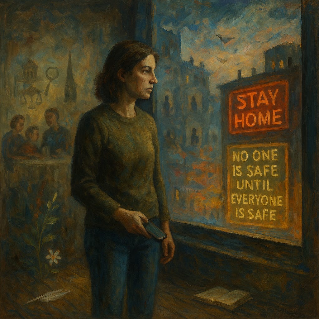 But it wasn’t just caution. What unfolded in the weeks and months that followed felt like something else entirely. I was disconcerted by the unrelenting tone of fear from the government and the media, night after night, the same doom-laden messages, the same rolling death tolls, the same press conferences steeped in anxiety and alarm. And then those slogans everywhere: “Stay Home. Protect the NHS. Save Lives.” “No one is safe until everyone is safe.” People banging saucepans on their doorsteps. Neon signs everywhere reminding you to stay apart and, perhaps, to stay afraid. It didn’t feel like solidarity to me. It felt performative. Conformist. Almost cultish.
