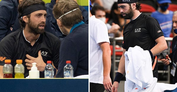 In other news Georgian Nikoloz Basilashvili couldn’t finish his match against Tsitsipas. At this point we all know what causes a young supremely fit athlete to grip their chest and withdraw from a match.