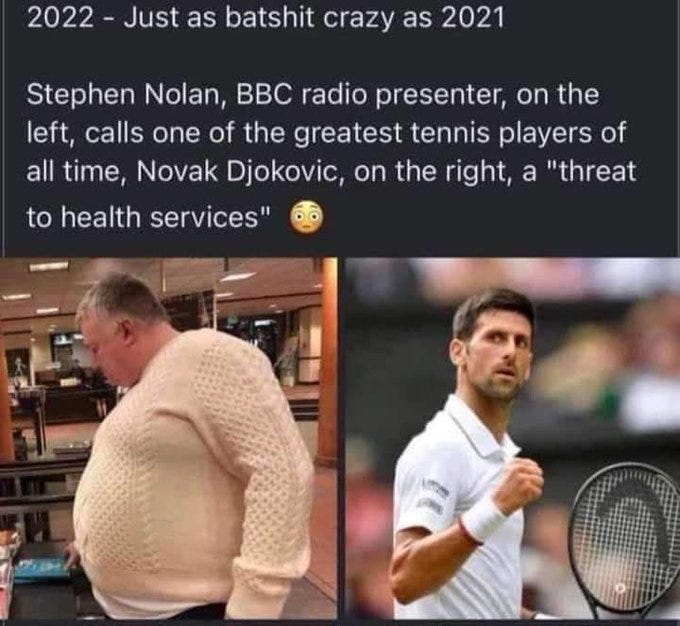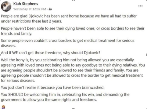 Our own tennis brat, Nick Kyrgios, instead came to Novak’s defence (sort of). Nick is pro-vax and is disappointed in the State’s handling of the matter. It’s not the full throttled defence of induvial choice and personal freedom, but I’ll take it. Are you paying attention Nadal?