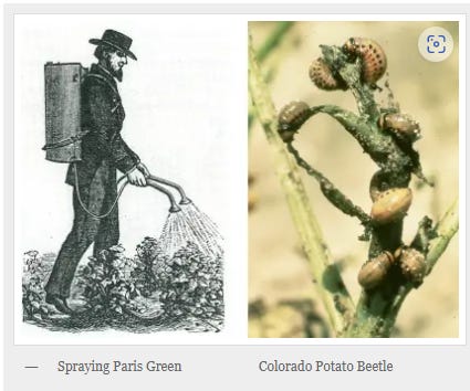 If you are wondering what they were trying to kill, well, one of the very early answers was the potato beetle, and the pesticide of choice was Paris green which is such a lovely name given for arsenic. Yes, they sprayed arsenic on crops, we ate those crops, then they played ignorant for decades about the ensuing paralysis. Thankfully they had a patsy virus to blame. Viruses are wonderful things, mainly because “viruses cannot be sued”.