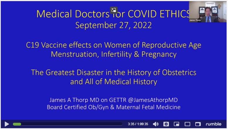 Dr. James Thorp spoke to us at Medical Doctors for Covid Ethics. Dr. James Thorp is a physician MD board-certified in obstetrics and gynecology, as well as maternal-fetal medicine. Dr. Thorp has practiced obstetrics for over 42 years and sees 6,000–7,000 high-risk pregnant patients a year.