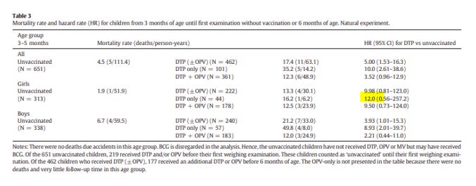 The researchers observed children who had received these vaccines between 3 to 5 months of age and compared them with children who hadn't yet been vaccinated. They found that children who had received the DTP vaccine (sometimes with the OPV vaccine, sometimes without it) had five times the risk of dying compared to children who hadn't received the DTP vaccine yet.