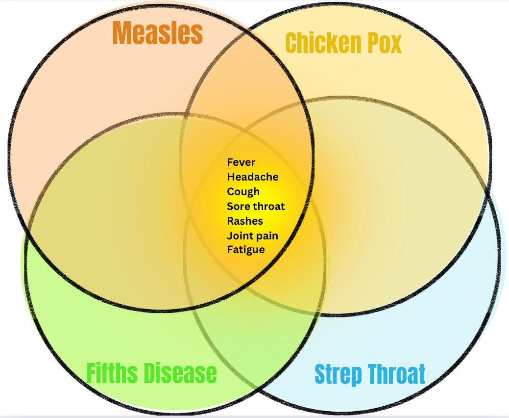 Oh look, here is a Venn Diagram I made of four childhood illnesses and their symptoms: