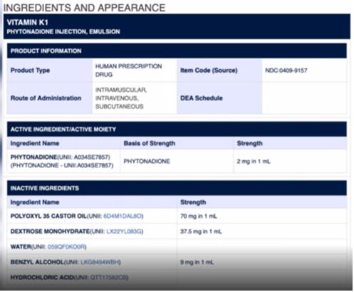 As to the ingredients, you can see the synthetic Vit K (phytonadione) is the smallest component of this injection. For example, there is 2mg of Vit K in 1 mL but there is: