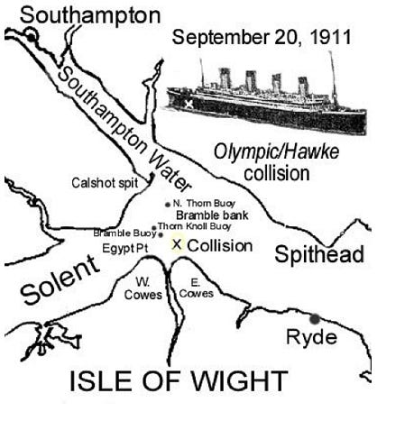 Then in September 1911, Olympic was involved in a massive, high-speed collision with the British Navy Cruiser HMS Hawke (‘The Hawke Incident’) after leaving Southampton Water and preparing to turn westwards travelling clockwise around the Isle of Wight off the southern coast of England.