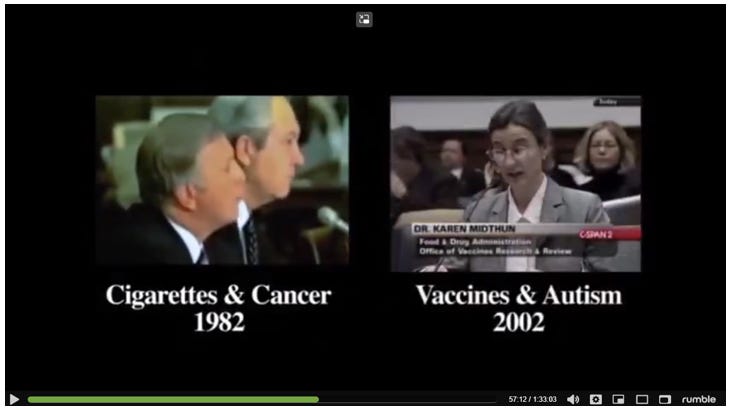 This was a great visual from the documentary, with side-by-side testimony, 20 years apart, by big tobacco and big vaccines.