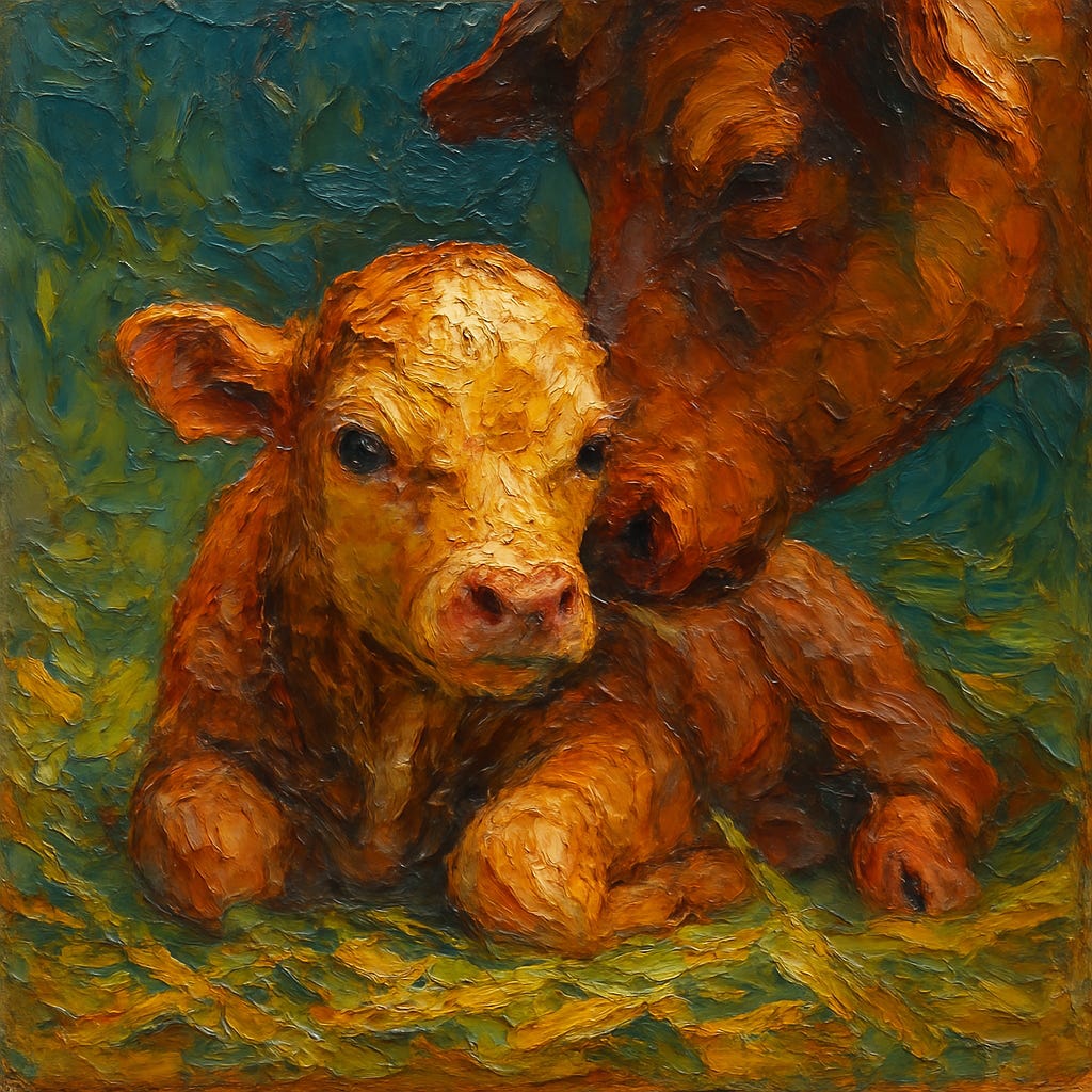 Klenner regularly administered 50, 60, or 100 grams by IV to treat serious conditions. The U.S. Government currently suggests that pregnant women take 0.080 grams per day. But that's a tiny amount compared to what a goat can make... When cattle are pregnant, if they get lots of grass and have access to minerals, they invariably have an uncomplicated birth. They make vitamin C, not like a goat, but dozens of grams, enough for a healthy pregnancy. They make plenty if they are living peaceful, low-stress lives, and have enough to eat. They convert glucose to vitamin C all day long, and when it's time, their bodies open up and the calf sometimes almost falls out. Calves often just appear in the field in the morning on our farm. We squint at them from a distance in wonder, sometimes asking "whose calf is that?"