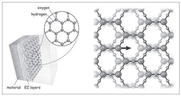 EZ water has a crystalline structure made up of layers of six-sided rings, slightly displaced. In ice, the layers of six-sided rings are not displaced. (Illustration from The Fourth Phase of Water, Ebner and Sons. Reprinted with permission.)