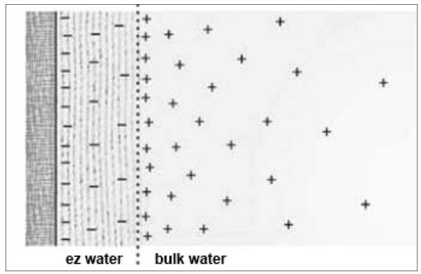 Against a hydrophilic surface (left), EZ water excludes all minerals and has a negative charge. Bulk water contains minerals and other compounds and has a positive charge. (Illustration from The Fourth Phase of Water, Ebner and Sons. Reprinted with permission.)