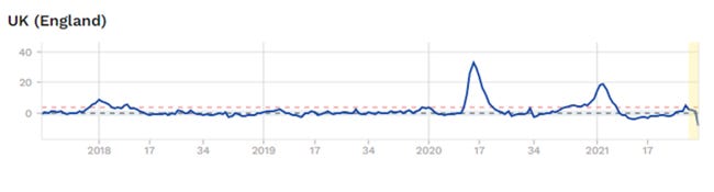 The graph starts in last quarter 2017. As you can see, a spike in overall mortality in Spring 2020, A spike in Winter 2020/21. Currently, no excess mortality at all. So, if COVID19 is infecting hundreds of thousands of people each week, it is not showing up as any excess deaths… at all 5.